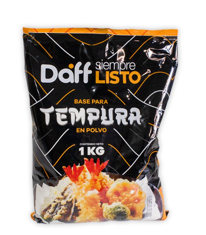 Tempura Daff 1 Kg es una mezcla de alta calidad para lograr rebozados ligeros, crujientes y dorados. Ideal para mariscos, verduras, carnes y preparaciones japonesas con resultados consistentes y profesionales.